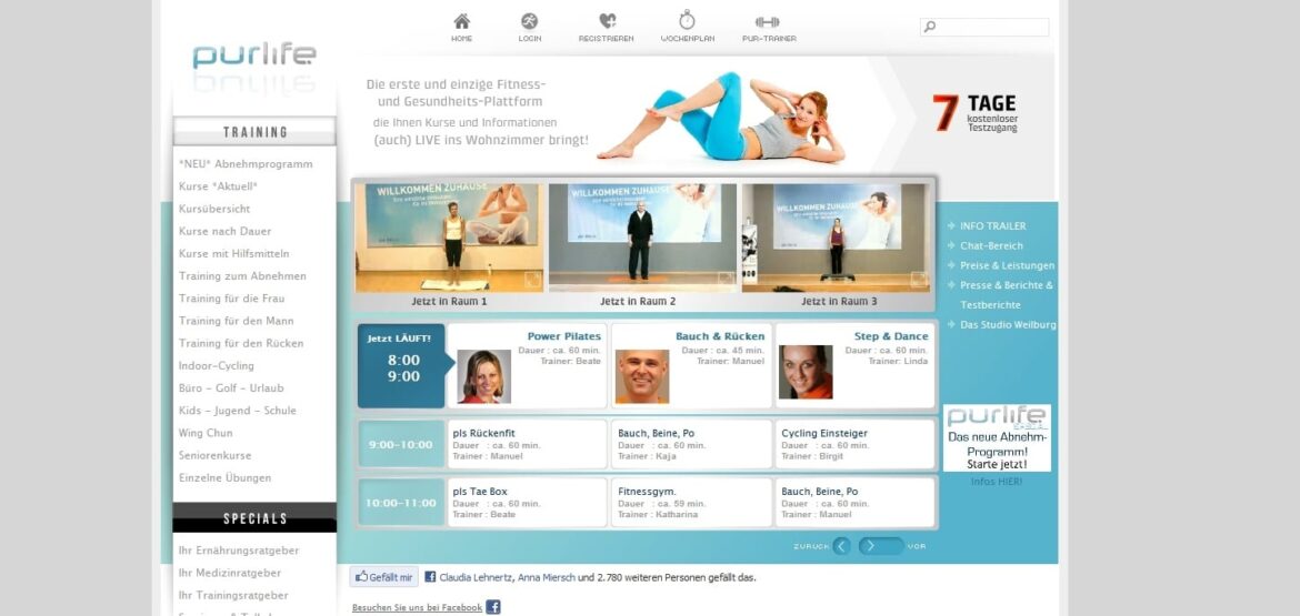 Pur-Lifeは、自宅でも外出先でも柔軟にトレーニングしたいすべての人のためのオンラインフィットネスプログラムです。トレーニングの内容は、自分で選ぶことができます。体重減少、筋肉増強、痛みの緩和、フィットネスなどの効果があります。しかし、栄養も重要な役割を果たしています。サイトは全部で6つのセクションに分かれています。