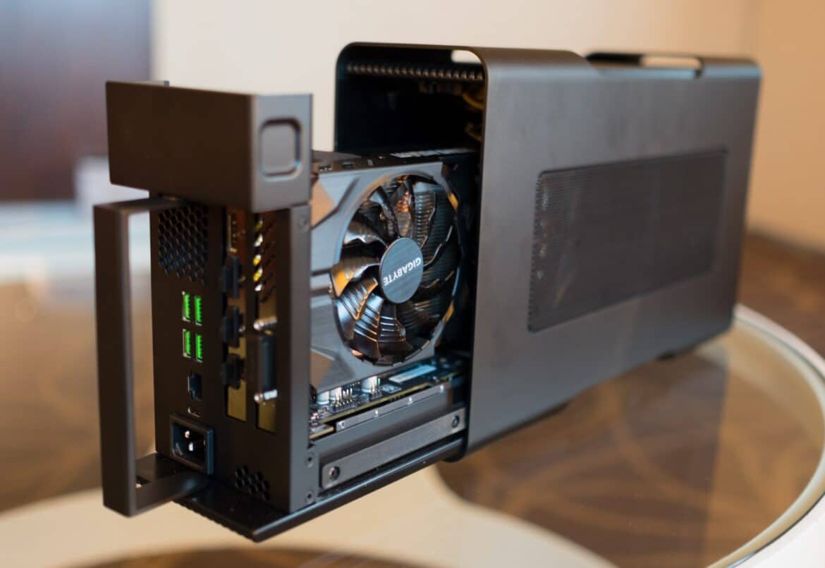 • Aby móc korzystać z zewnętrznej karty graficznej, niezbędna jest obudowa eGPU. To właśnie w niej mieści się karta graficzna. Przy zakupie należy upewnić się, jakie karty graficzne pasują, ponieważ nie każda obudowa jest kompatybilna z każdą kartą.